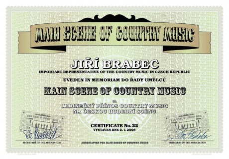 schváleno in memoriam dne 25.4.2008 v Brně, vyhlášeno dne 2.7.2008 (Country Rádio) a opětovně pak dne 2.8.2008 na festivalu Starý dobrý western. Certifikát následně předán Šárce Rezkové při setkání u Miroslava Hoffmanna dne 25.7.2009