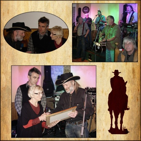 certifikát o nedávném uvedení Ladislava VODIČKY do řady umělců Main Scene of Country Music přebírá paní Věra Vodičková a Ladislav Vodička ml. (foto Jana Nováková a archív asociace)